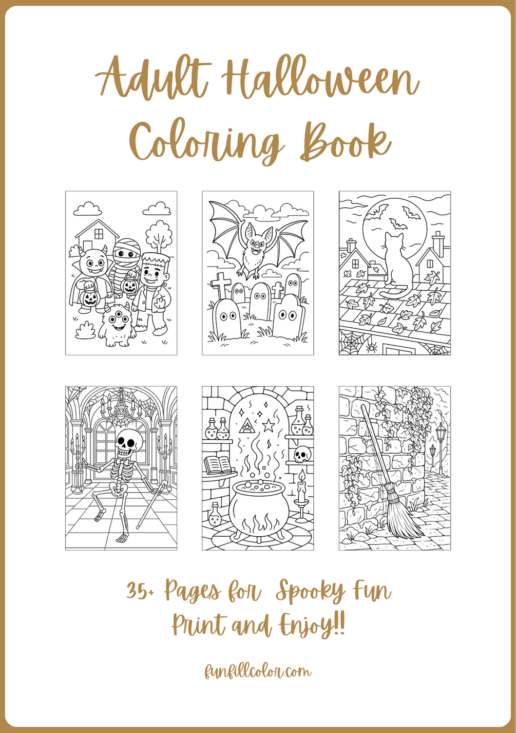 - 35+ Unique Coloring Pages: Featuring a variety of Halloween themes including witches, pumpkins, haunted houses, skeletons, and more.