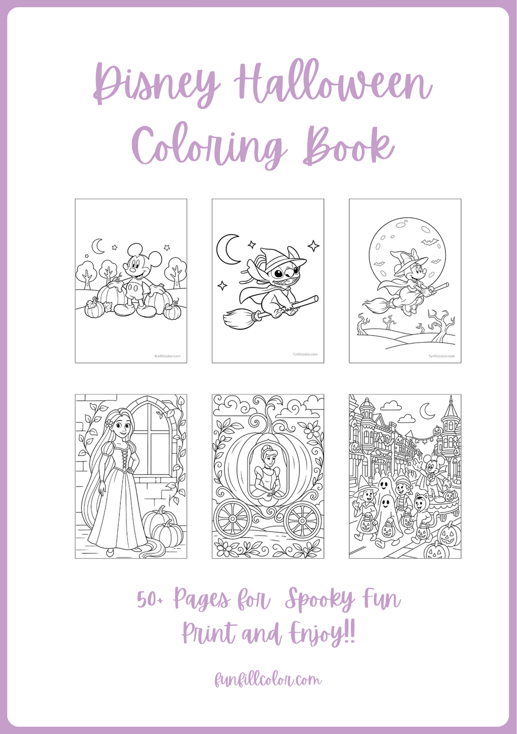- 50+ Pages of Disney Halloween Designs: Pumpkins and ghosts to haunted houses and witches, enjoy a wide range of spooky themes featuring beloved Disney characters.